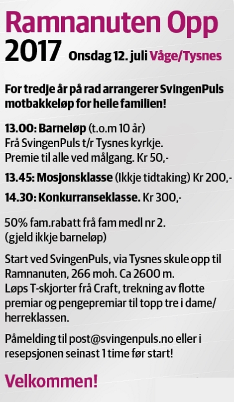 For dei som skal til topps på Ramnanuten i mosjonsklassen og konkurranseklassen, er det påmelding til post@svingenpuls.no, eller i resepsjonen seinast ein time før start.