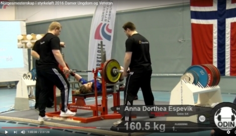 I styrkeløft er det om å gjere å klare mest i øvingane knebøy, benkpress og markløft. I benkpress klarte Anna Dorthea heile 160,5 kg. Det var ikkje berre ny norsk rekord i klassen ungdom, men også i open klasse!