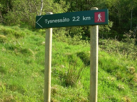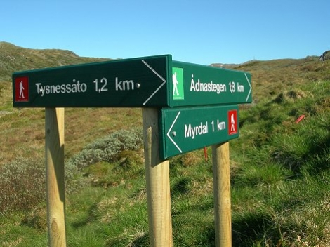 Frå parkeringsplassen i Myrdal til Tysnessåta er det kome fleire skilt, bl.a. på toppen av Buskaret. Herifrå er det no merka løype til Ådnastegen.