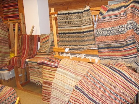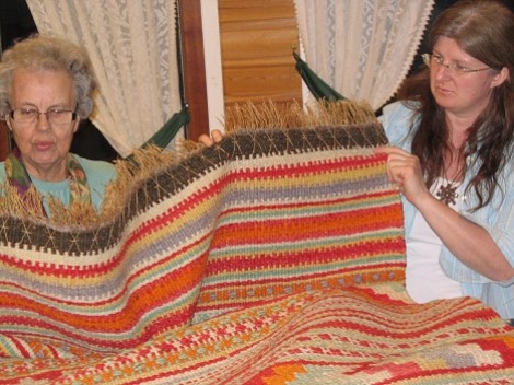 Ho fortalte og om fargane, i 1875 kom ? fargar og det vart meir fargerikt. Me såg mange skarpe fargar når me pirka i trådane, og det var mykje skarp raudt og lilla. Mange av teppa var falma mykje og det synte godt at mange var mykje brukte.