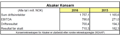 Alsaker-konsernet, som er konsernselskapet til Alsaker Fjordbruk, fekk eit resultat før skatt på kroner 710 millionar i 2016. Med ein omsetnad på kr 1.757 millionar gir dette ein resultatmargin på 40,4 %.
