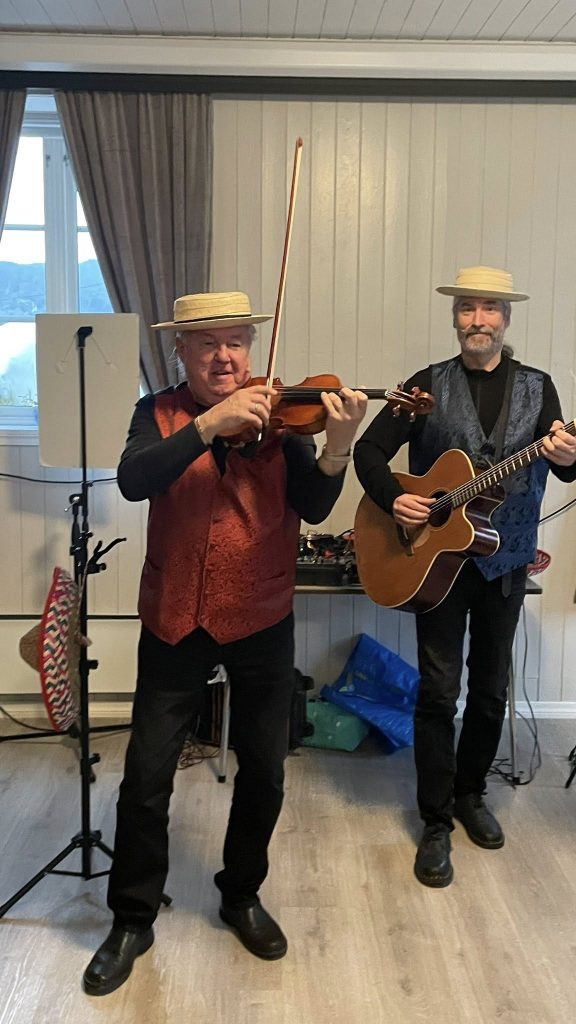Deretter fekk me eit musikalsk innslag av to trubadurer; Leslie frå Ungarn og Tarjei frå Bergen. Artige karar med både ablegøyer og herlig musikk.
