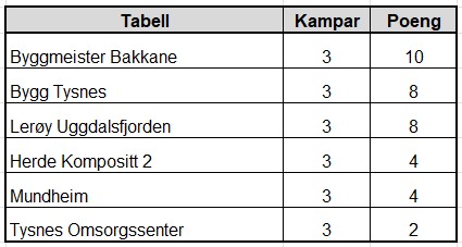 Bygg Tysnes og Lerøy Uggdalsfjorden følgjer to poeng bak.