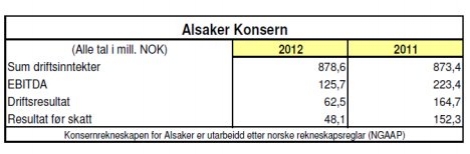 Alsaker-konsernet, som er konsernselskapet til Alsaker Fjordbruk, fekk eit drifsresultat på kr 62 millionar i 2012. Med ein omsetnad på 879 millionar gir dette ein driftsmargin på 7,1 %.