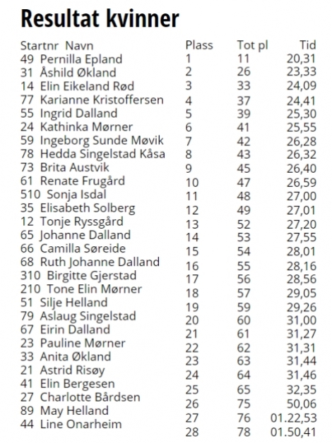 Kvinneklassen vann Pernilla Epland med tida 20:31.