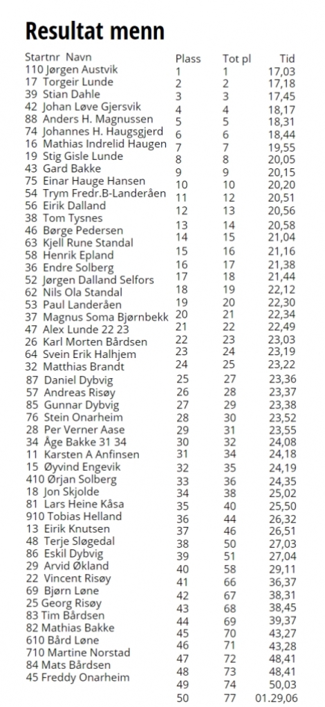Vinnar i herreklassen vart Jørgen Austvik med dagens bestetid 17:03.