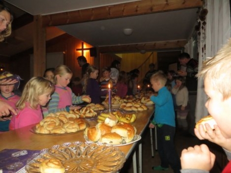 Etterpå går me inn i bedehuset og får bollar og varm kakao.
