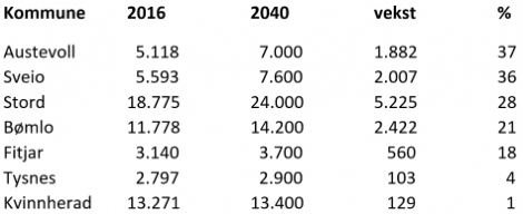 På Tysnes ser dei for seg ein auke på beskjedne 4 % frå 2016 til 2040 og at folketalet dermed vil vere om lag 2900 personar.
