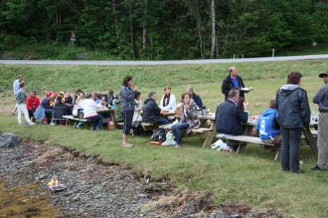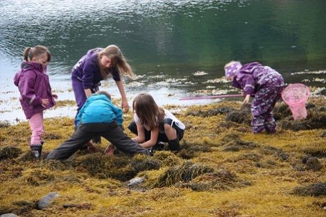 Innimellom grillinga kosa folk seg ved benkane, og ungane var ivrige på leit etter krabbar og ål i sjøkanten.