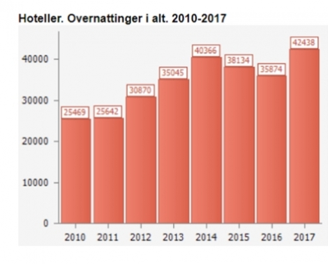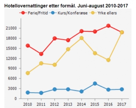 (sjå tabell: Hotell: Overnattingar i alt. 2010 – 2017 og sjå tabell: Hotellovernattingar etter formål juni – august. Kjelde: SSB)