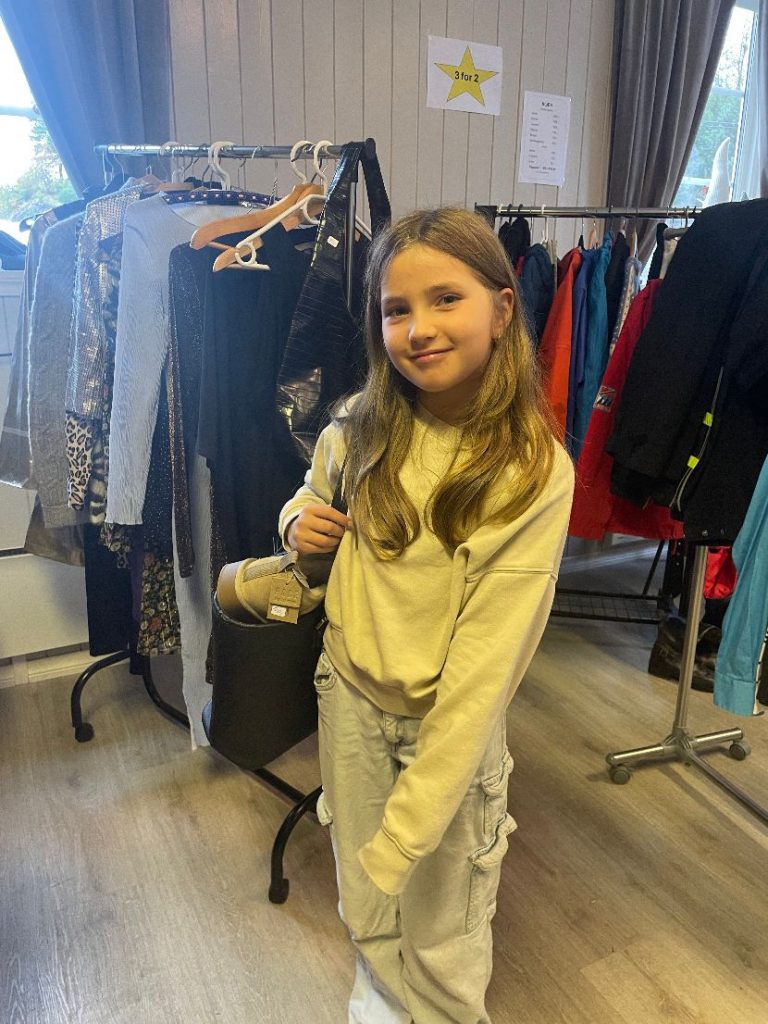 Vilja Marie Sæveruds- Mehammer var med bestemor Britt på marknad og hadde kjøpt seg både sko, og veska til og bera dei nyinnkjøpte tinga sine i.