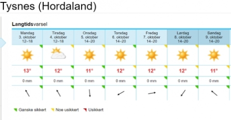 Den flotte dagen i dag er berre forsmaken på ein ny godvêrsperiode. Litt kjøligare vert det, spesielt om nettene, men sol og opphald heile veka som kjem. Så får ein håpa at vêret held seg enda ei veke, då har skulane på Tysnes haustferie.