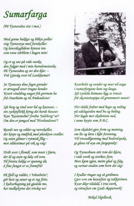 Diktet er skrivet av Tysnesingen Mikal Skjellevik i 1962. No har oldebarna satt melodi og vokal til diktet.