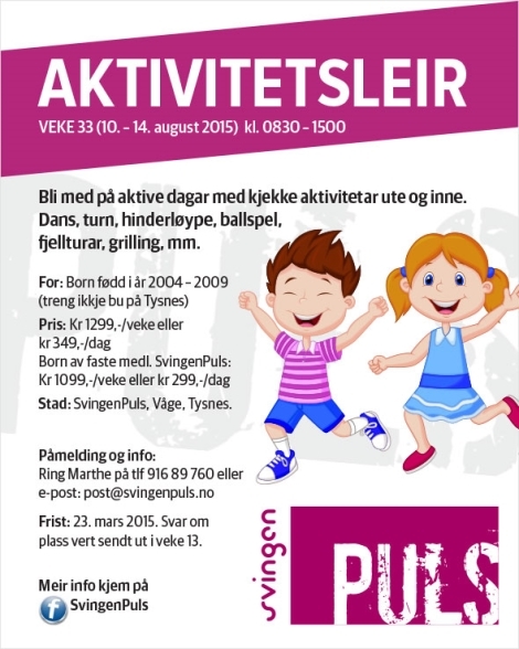 Svingen Puls melder til Tysnesingen.no at dei i sommar vil arrangera ein aktivitetsleir for born!