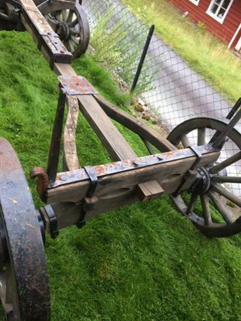Gammel tømmervogn med justerbar lengde.