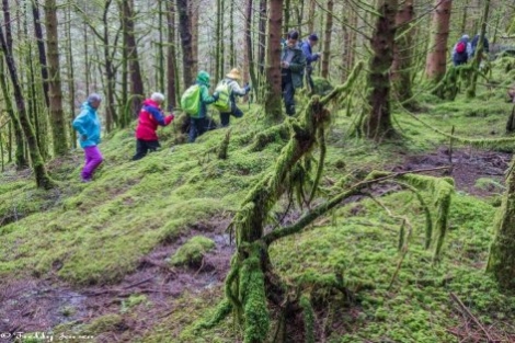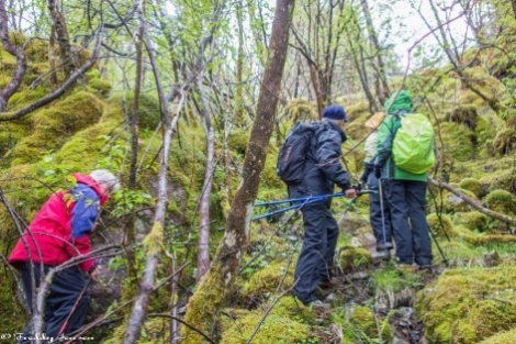 Slett ingen lett tur i lett regn, og med sleip skogbunn. Igjen fikk vi visselig se hva stormen “Nina” hadde stelt til. Vi måtte gå omveger og krabbe under falne trær, men opp til tjernet kom vi oss til slutt.