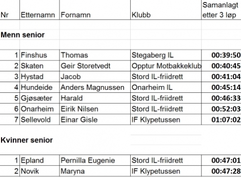 Tour de Stord vart i helga arrangert av Stord IL-Friidrett for andre gong. Klubben seier at dei med dette arrangementet ynskjer å sjå kven som er den sterkaste løparen når det er prolog, jaktstart og motbakkeløp over 3 løpsdagar. I klassane senior og junior for menn og kvinner var det beste samanlagt tid for dei tre løpa var vinnarar. Veteran løparane fekk omrekna tidene dei oppnådde i kvart løp ved hjelp av ein faktor i IAAF veterantabellen slik at dei vart jamstilt med seniorklassen.