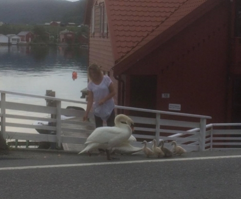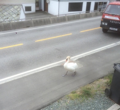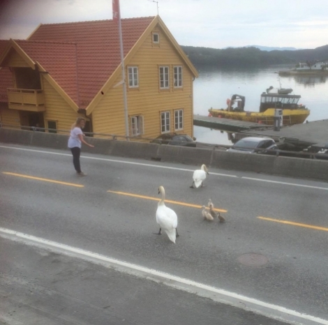 Ein svanefamilie som hadde lagt turen sin til Våge, skapte trafikk-kork i morgontimane.