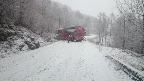 Det er svært glatt på staden. Det er ikkje meldt om personskadar, men det er lekkasje i tanken på bilen.