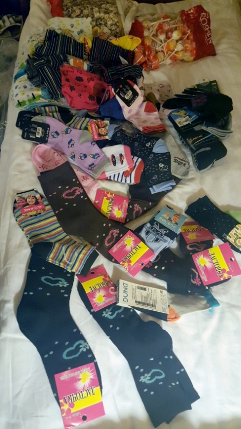 Over 50 par sko vart kjøpt inn på markedet, like mange sokkar vart lagt i skoa. 1 vaskemaskin, eit toalett(til barneavdelinga på sjukehuset), frukt og godteri til ein billig peng (1 kg smågodt kosta 20,-).
