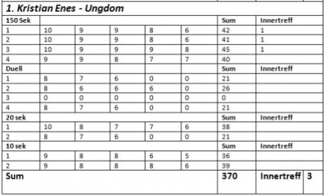 Kristian Enes skjøt godt og vart Tysnes mester for ungdom. Veldig bra at han stiller opp i mesterskap etter to måneder skyting. Dette viser fin interesse for pistolskyting.