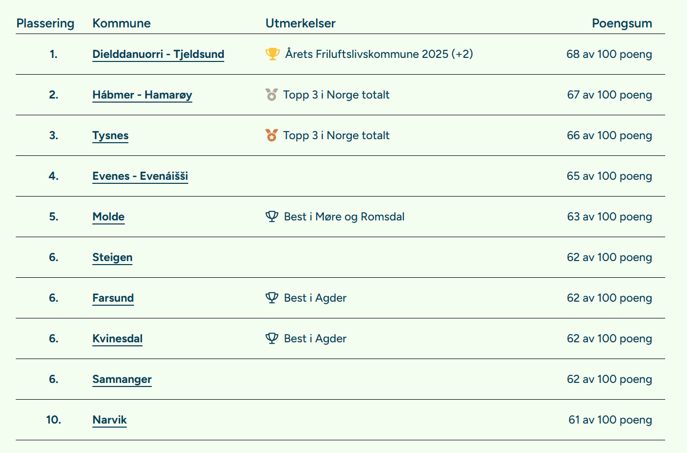I samband med Friluftslivets år 2025 er det utvikla eit nytt verktøy: “Friluftslivsbarometeret”. No er alle landets 357 kommuner vurdert og rangert på innsatsen for friluftsliv. Kommunane vart vurdert på 30 indikatorar fordelt på 4 tema: friluftslivsaktivitet, tilrettelegging, areal, og planer og organisering. Barometeret er utvikla av Norsk Friluftsliv og Friluftsrådenes Landsforbund.