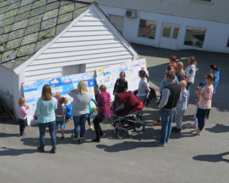 Ved inngangen til hamna kunne ein sjå alle teikningane som elevane ved Uggdal skule hadde laga av Eliasbåten.