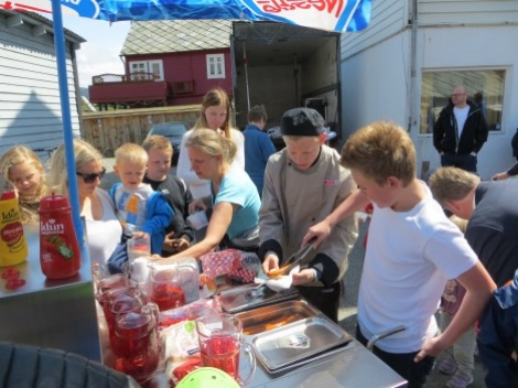 Desse gutane samarbeidde effektivt og godt, og serverte gratis hotdog til dei frammøtte.