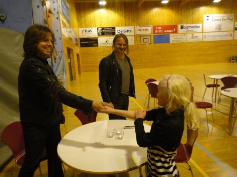Joey Tempest og Mic Michaeli møter underteikna og niesa Marie (9) for intervju i Tysneshallen.