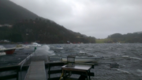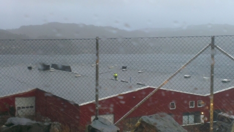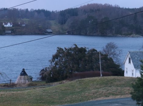 Både tre, tak, og delvis bygningar måtte gje tapt då “Nina” herja som værst i går. Mange har også fått skade på båtar og kaianlegg.